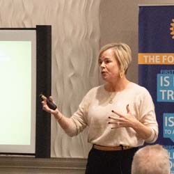 As Peninsula Club Foundation Chair Kevin Yeargin looks on, District Foundation Chair John Padgett welcomed President Elizabeth as a member of the Paul Harris Society.